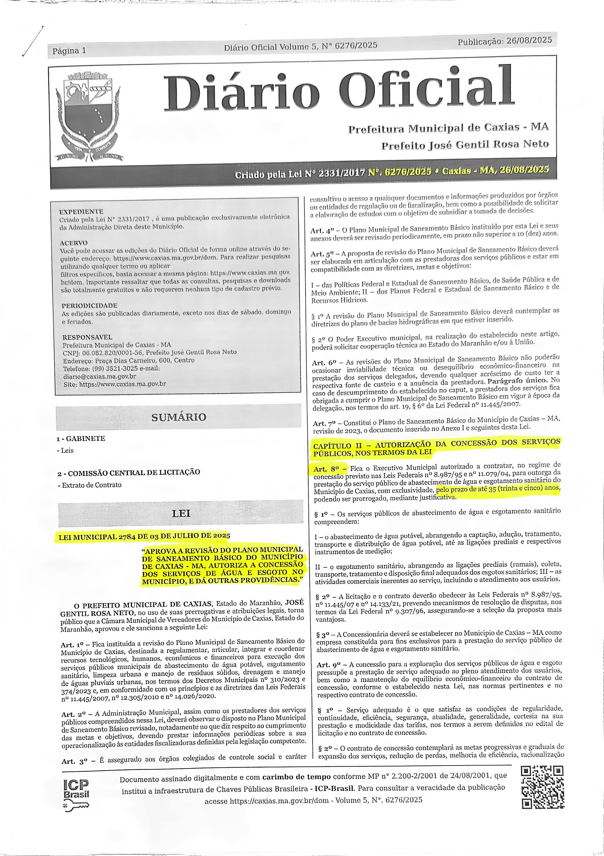 A Lei Municipal 2784/2025, que deveria tratar exclusivamente da revisão do Plano Municipal de Saneamento Básico, veio com um golpe escondido: um artigo autorizando a concessão dos serviços de água e esgoto de Caxias por até 35 anos.